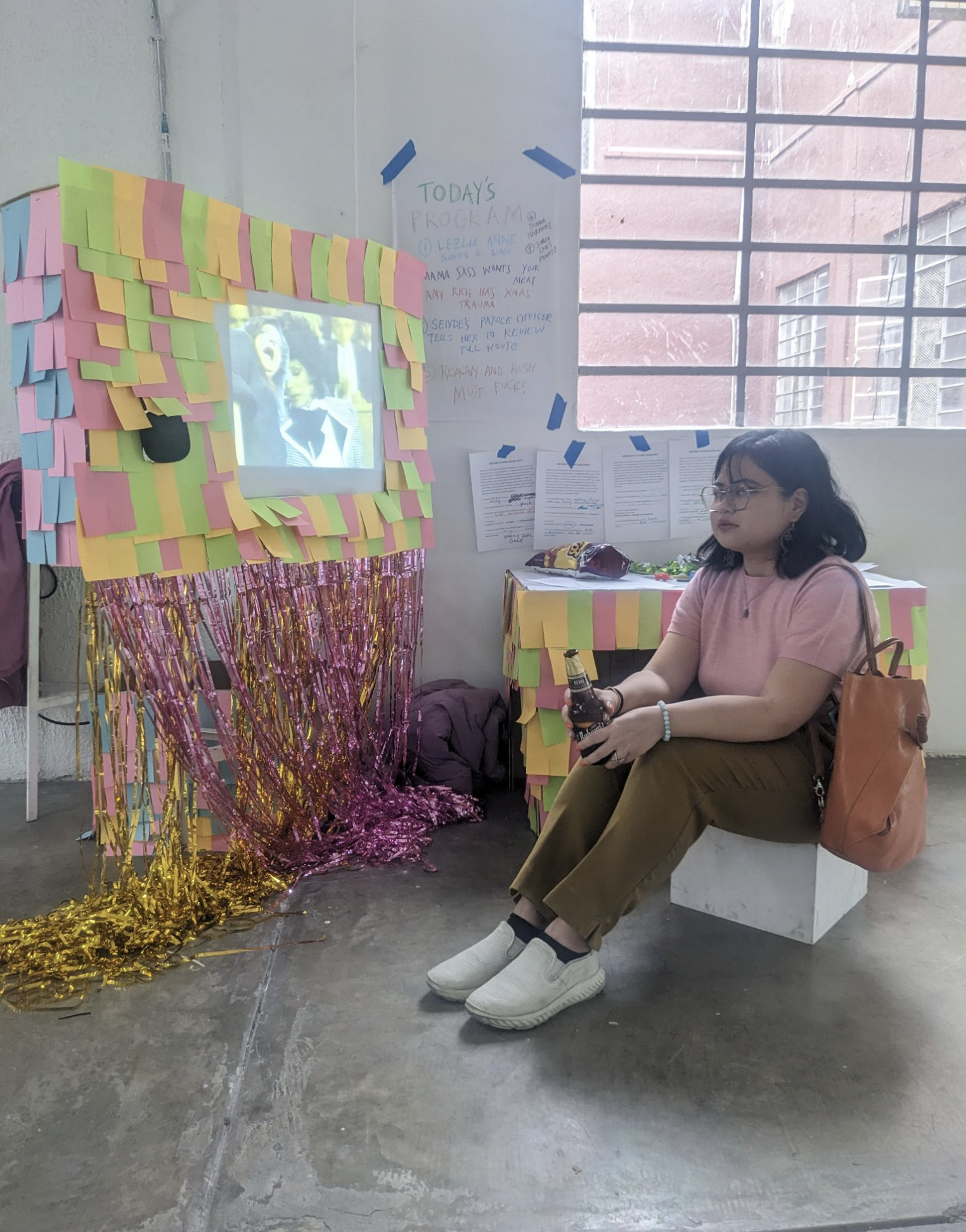 Carissa Pobre sits at an interactive installation with video materials from Public Access Party in Mexico City, 2024